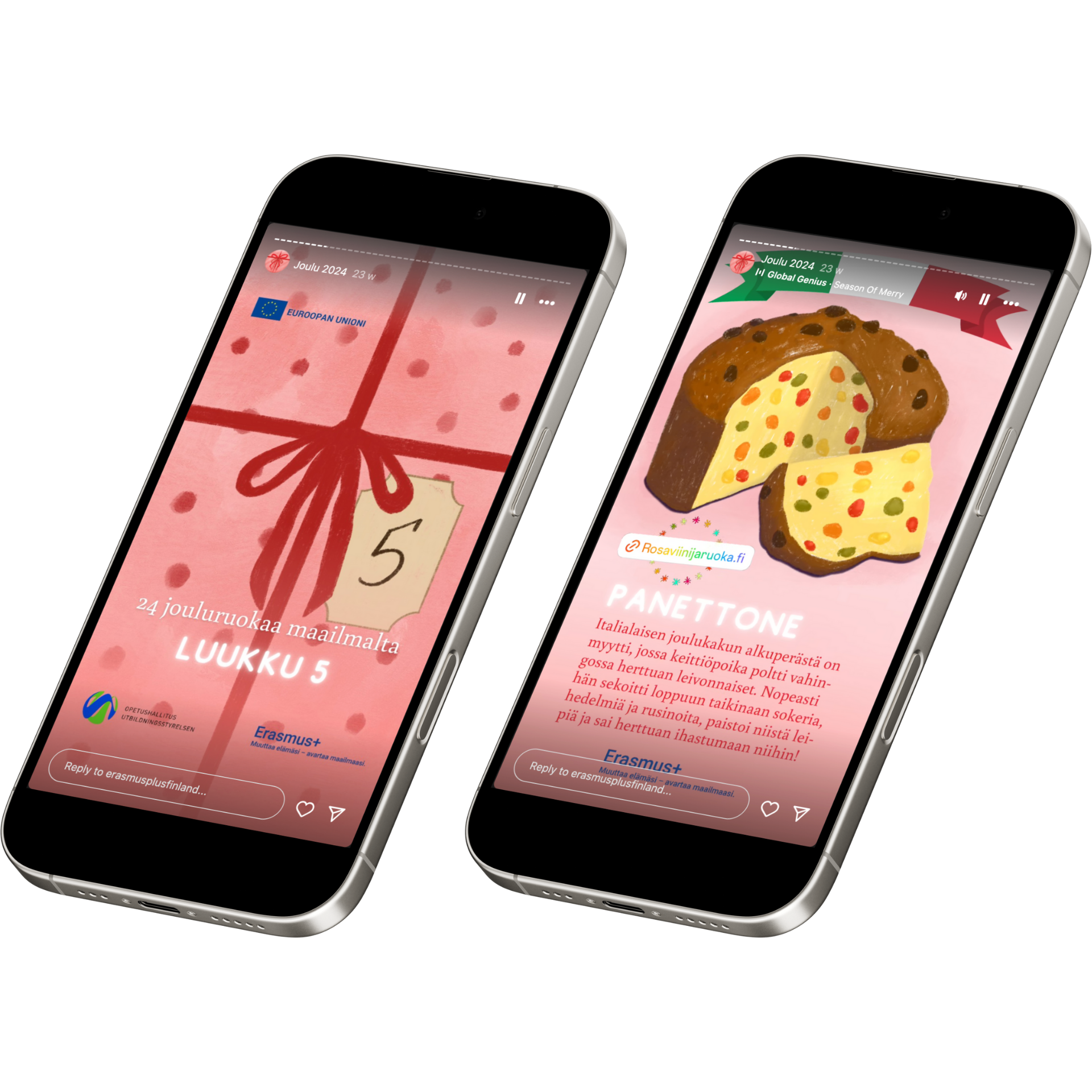 I pitched an idea of showcasing Christmas foods from around the world. It was well-received and felt like a fun and interactive idea. This theme was a fairly simple concept and allowed for strong visual storytelling and cultural variety. I created 24 unique food illustrations and wrapping paper backgrounds using Procreate, opting for a soft, painterly style. I chose this style for its charming appearance and time efficiency. For layout and text design, I used Canva Pro, the tool preferred by the Finnish National Agency for Education (Opetushallitus), which also made collaboration and possible edits easier with my mentors. To enhance content engagement, I incorporated recipe links for all the foods in the posts. This encouraged users to engage with the content beyond passive viewing—aligning the visual design with social media strategy.